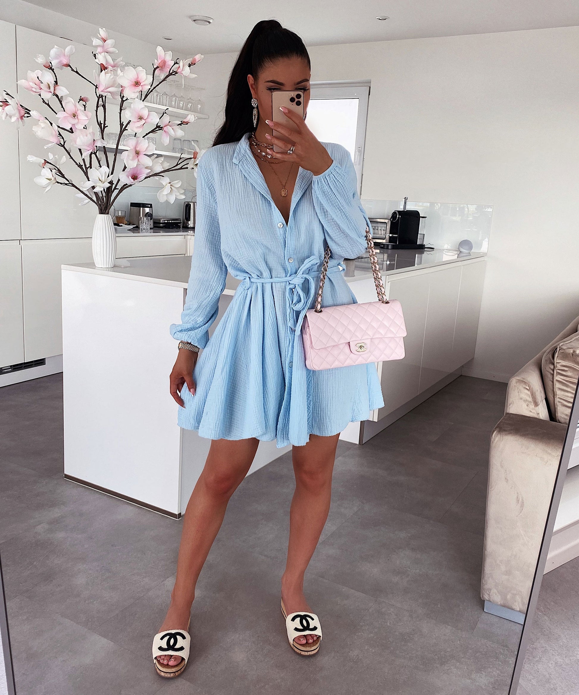 Lockeres Kleid was durch den Gürtel detailliert werden kann. Einheitsgröße passt XS-XL. Model ist 1.65m groß und trägt regulär Größe S (36).