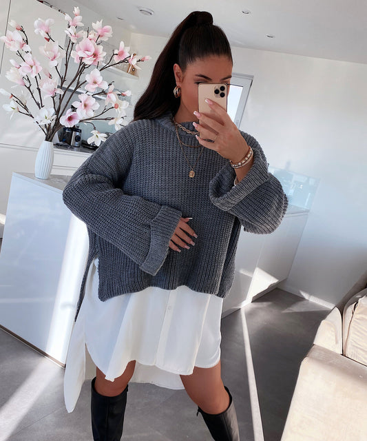 Plus-granda mantelo kun kolorblokado, falintaj ŝultroj kaj duoblaj butonumitaj fendoj