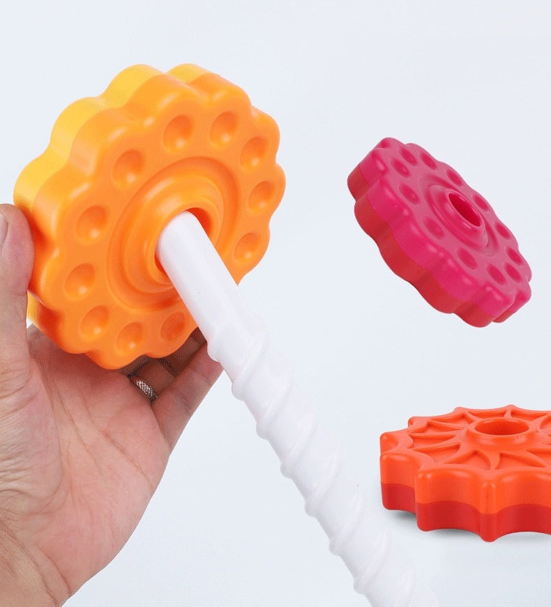 Der Drehturm verfügt über einen stabilen Sockel und eine Spiralstange, mit der dein Kind die Scheiben bis zum Sockel drehen kann. Er enthält sechs Scheiben in zwei Farben, die in jede Richtung gedreht werden können.